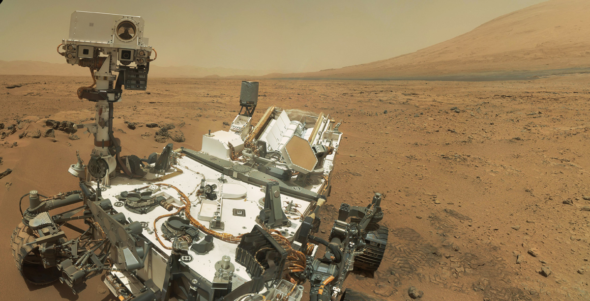 Below: Never before has a more capable rocver been to Mars. it has several color cameras, including one on its extendible arm, the 'MArs Hand Lens Imager' or MAHLI which obtained a rover 'self portrait' which is shown here in part, and slightly recolored..