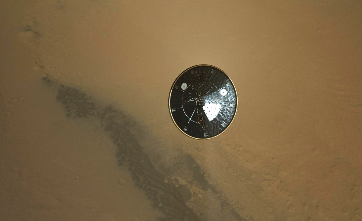 Below: This color view, modestly readjusted, shows the dark dune fields that would appear along the northern horizon in the first surface views from the rover. The aeroshell which protected the rover during atmospheric entry falls away in this cropped frame of the MARs Descent Imager, (MARDI) landing sequence, in which 4 high quality frames per second were obtained during the descent.