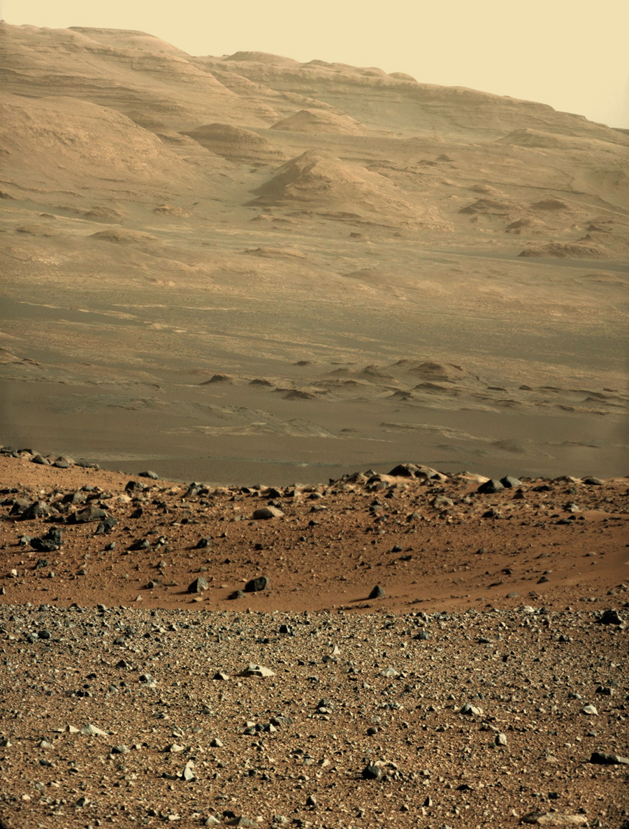 Soon we saw the surroundings, with the dark dunes between us and Mt. Sharp looming far above the horizon.