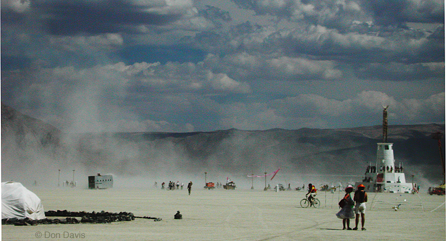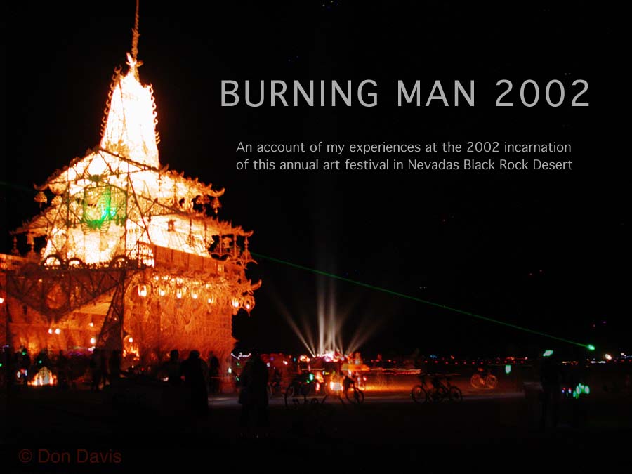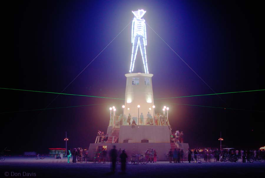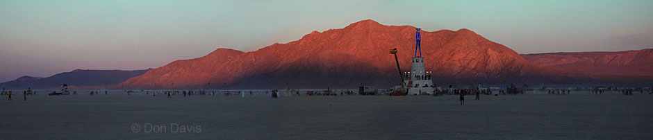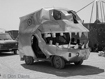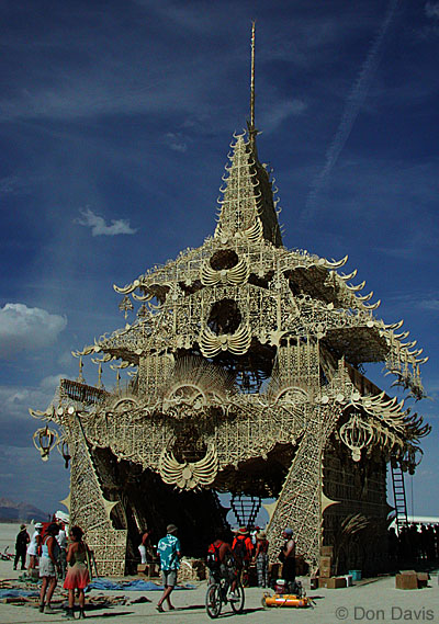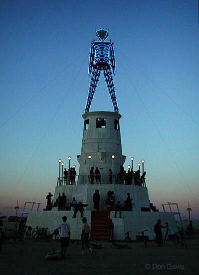 After sleeping well, I was awakened a bit early by the sunlight on my tent which caused heat to radiate from all the tent walls it touched. I decided then to finish applying the insulation to the tent. I got up and in still air began opening more 'space blankets', cutting them to roughly match the gaps in the coverage and taping them to the mylar and the tent. Wandering about later, I saw many beautiful camps already set up along the streets. Everywhere there was hammering, sawing, painting, drilling and welding going on. That night I walked up to the man and climbed the accessible portions of the elaborate wooden pedestal