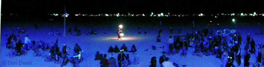 The blue neon lights defined the outlines of the Man, largely hidden from the walking areas of the pedestal. The blue neon bathed the surroundings where people milled about, sat and lay in couples and small groups along with various parked bicycles. The blue illumination faded off toward the horizon, which was defined by the bright string of distant lights.