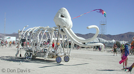 A truer index of response to actual needs of the event seems to be shown by the professional conduct of the police, who tended not to ferret out minor private transgressions but prominently and swiftly dealt with specialty jobs like the violent maniac Wednesday night. The Pershing County sheriff deputies issued only 2 drug related citations, down from 9 last year. Another level of crack down was felt by camps giving or bartering away alcohol, with 6 being visited by deputies and failing their state law compliance examinations, but at least only warnings were issued, in a show of commendable professional restraint. I heard of other camps with food given away getting surprise health inspections as well. There were about 60 police there this year, up from about 50 the previous year.
